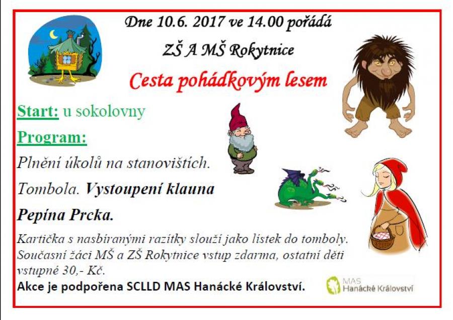 ZŠ a MŠ Rokytnice zve všechny děti na Cestu pohádkovým lesem. Akce se koná v sobotu 10. června ve 14 hod. Více informací na plakátku.