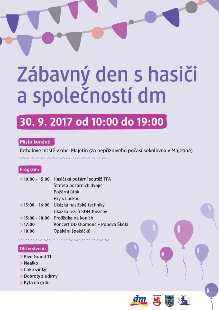 Pozvánka na Zábavný den s hasiči a společností dm v Majetíně. Akce se uskuteční v sobotu 30. září od 10 hod. Více informací na plakátku.