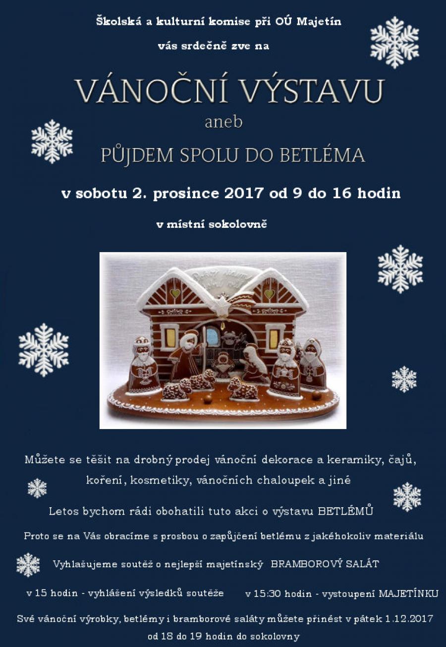 Školská a kulturní komise při OÚ Majetín Vás srdečně zve na vánoční výstavu aneb Půjdem spolu do Betléma. Akce se uskuteční v sobotu 2. 12. 2017 od 9 do 16 hod. v místní sokolovně. Více informací na plakátku.