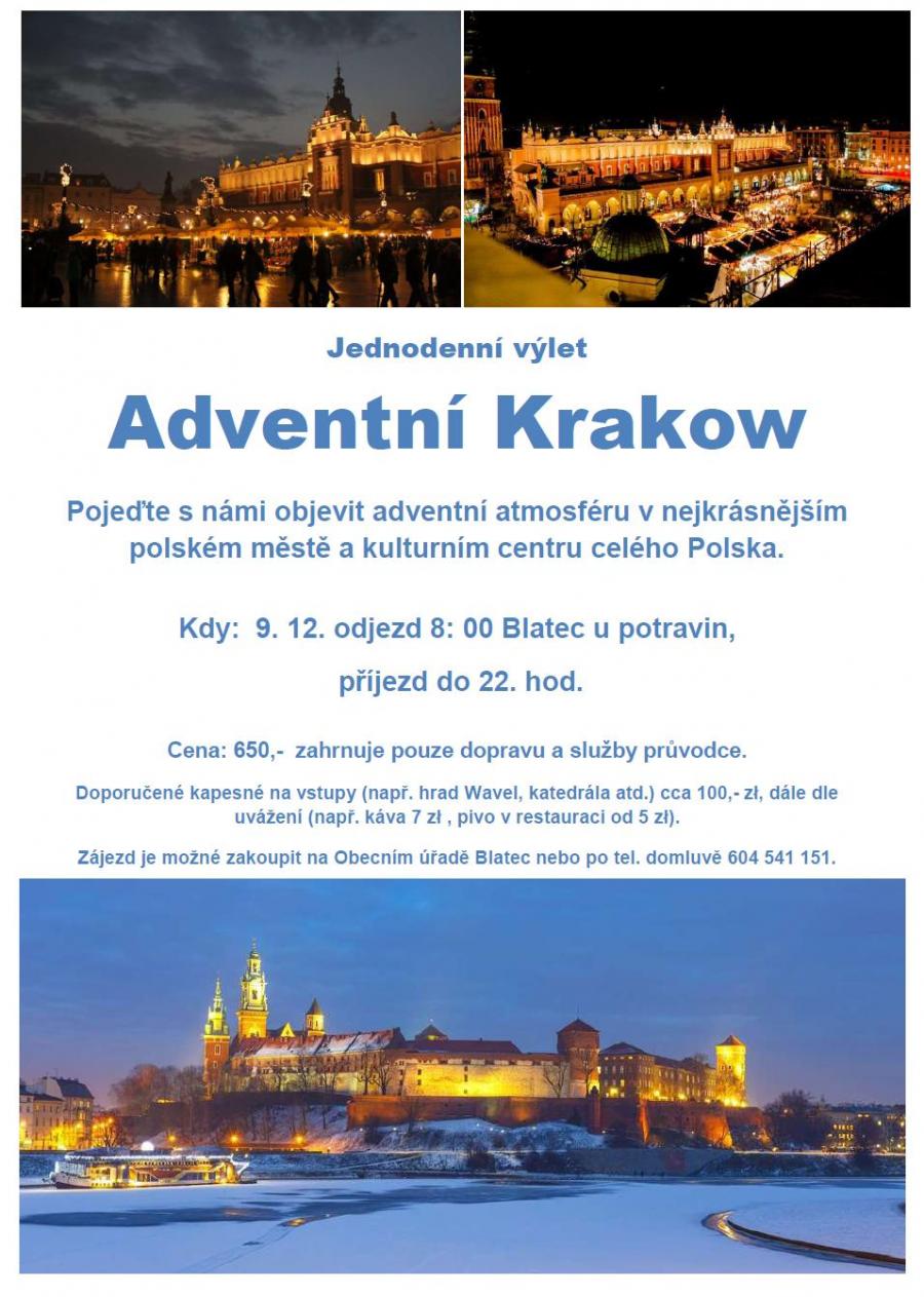 SRPŠ při ZŠ a MŠ Blatec pořádá jednodenní zájezd do nejkrásnějšího polského města. Adventní Krakov se stal fenoménem a každým rokem láká zástupy návštěvníků, které láká především kouzlo vánočních trhů na hlavním náměstí, místní řemeslné produkty (z kůže, z jantaru,...) a místní gastronomie (žurek, bigos, boršč, pierogy, apod.).