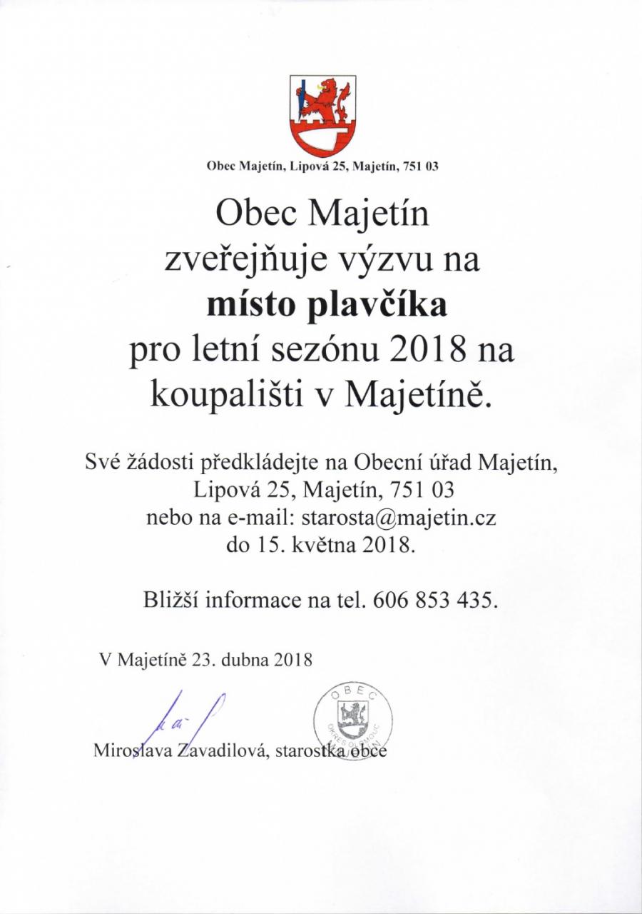 Obec Majetín zveřejňuje výzvu na místo plavčíka pro letní sezónu 2018 na koupališti v Majetíně. Více informací na plakátku.