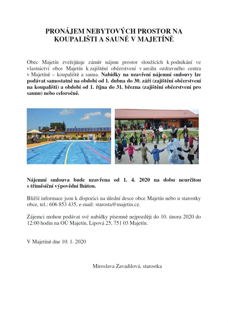 Obec Majetín zveřejňuje záměr nájmu prostor sloužících k podnikání ve vlastnictví obce Majetín k zajištění občerstvení v areálu ozdravného centra v Majetíně – koupaliště a sauna. Nabídky na uzavření nájemní smlouvy lze podávat samostatně na období od 1. dubna do 30. září (zajištění občerstvení na koupališti) a období od 1. října do 31. března (zajištění občerstvení pro saunu) nebo celoročně.