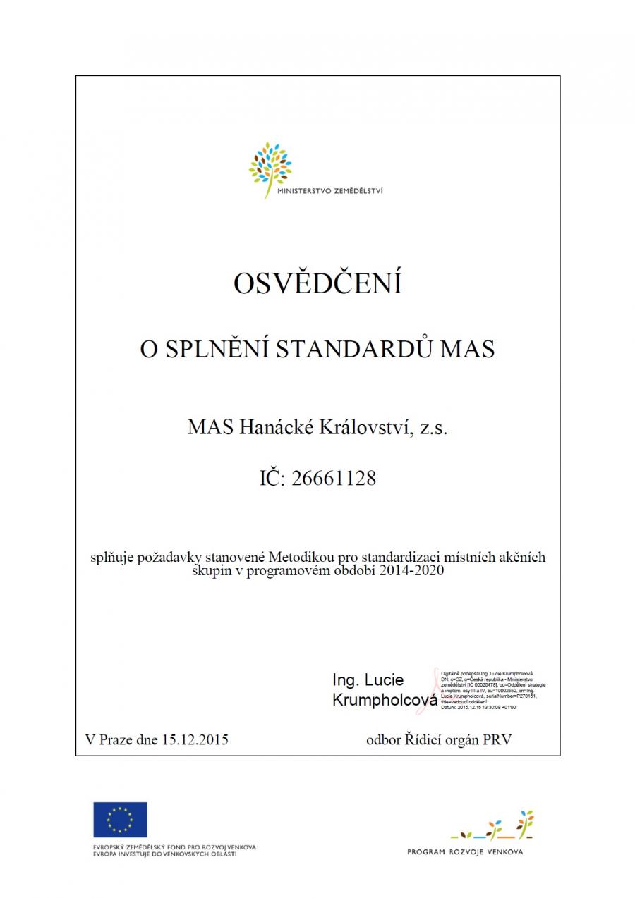 Dne 15. prosince 2015 obdržela MAS Hanácké Království tzv. Osvědčení o splnění standardů MAS, které bylo na základě podané žádosti o standardizaci vydáno Ministerstvem zemědělství ČR. Součástí celého procesu byla mimo jiné změna stanov či nová volba členů povinných orgánů. Standardizace tak završuje téměř dvouleté úsilí o splnění potřebných kritérií. Tím se otvírá pro subjekty z území MAS možnost čerpat podporu z EU prostřednictvím právě naší MAS. Bližší informace pro žadatele budeme pravidelně zveřejňovat také zde na webových stránkách.