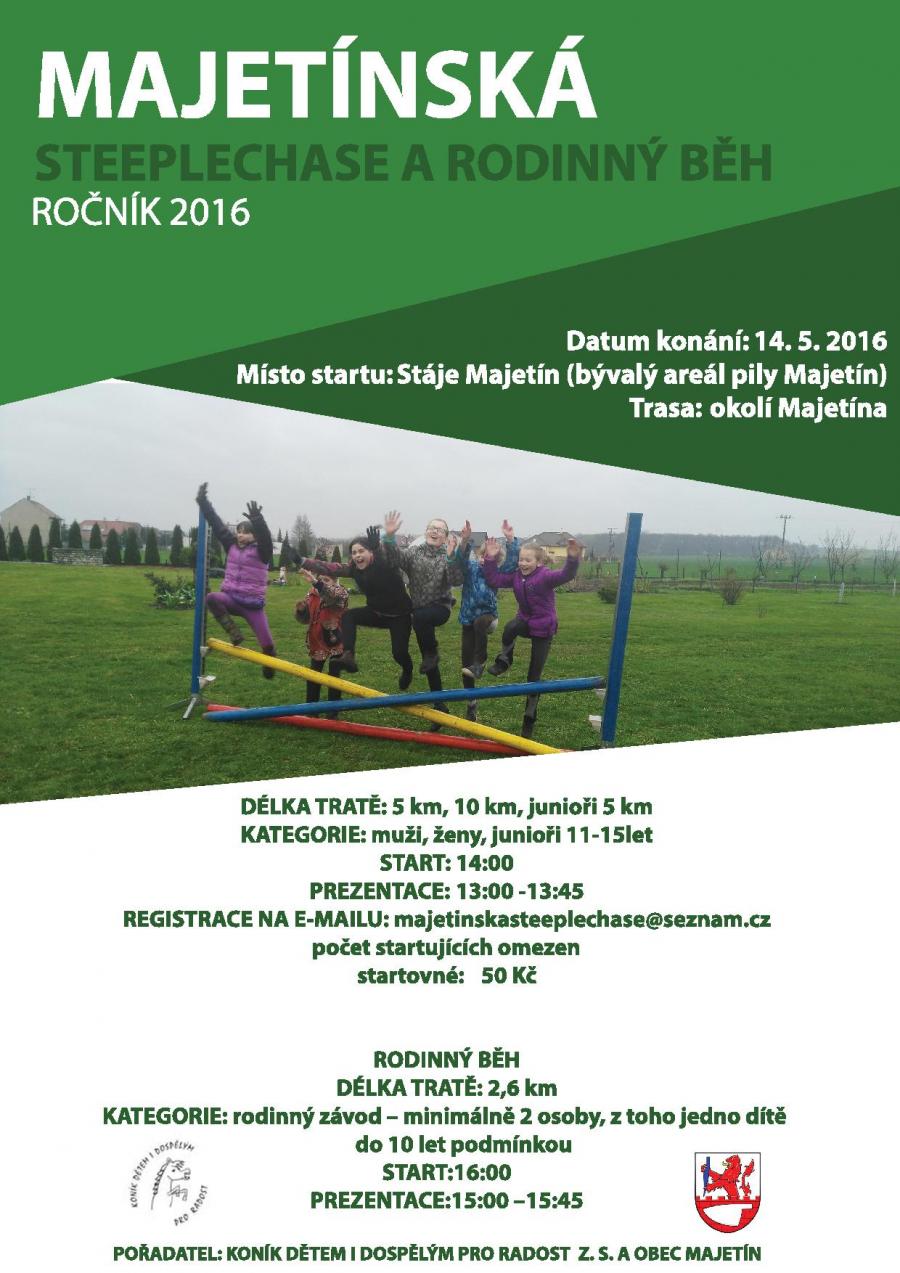 Zveme Vás do Majetína na 1. ročník Majetínské steeplechase a rodinného běhu. Akce se uskuteční v sobotu 14. května. Více informací na plakátku.