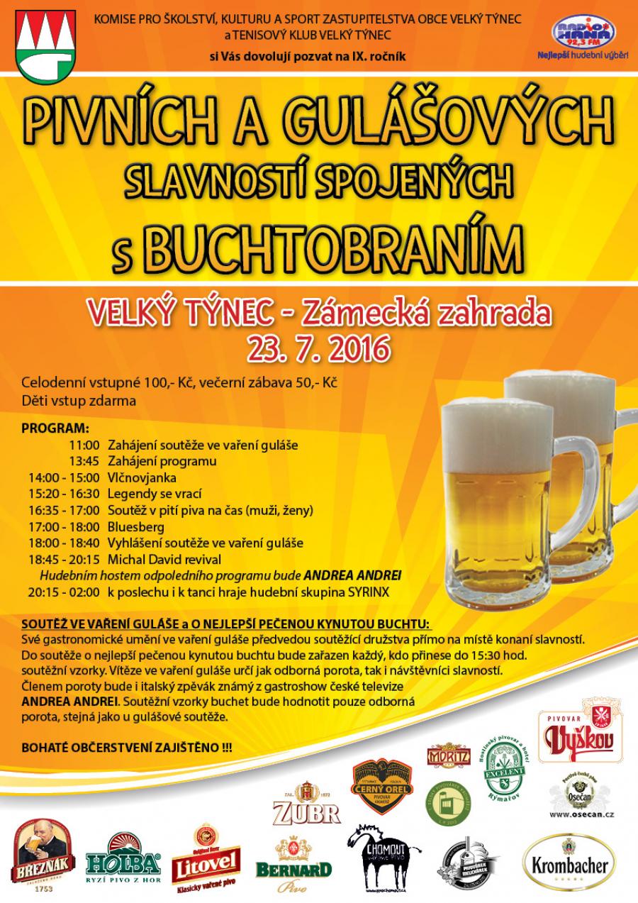 Pozvánka na IX. ročník Pivních a gulášových slavností, které se uskuteční 23. července v Zámecké zahradě ve Velkém Týnci. Více informací na plakátku.