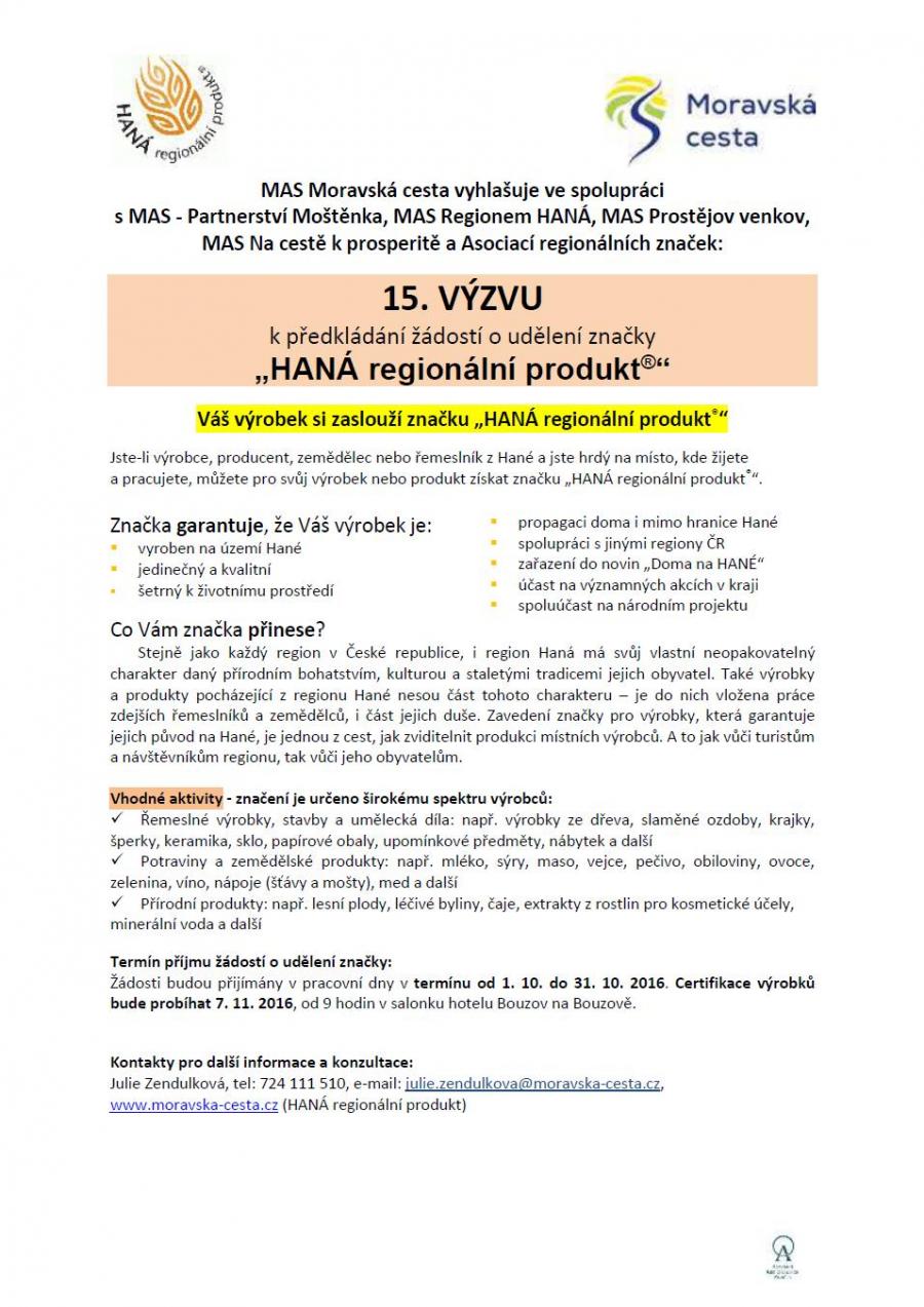 MAS Moravská cesta vyhlašuje ve spolupráci s MAS - Partnerství Moštěnka, MAS Regionem HANÁ, MAS Prostějov venkov, MAS Uničovsko, MAS Na cestě k prosperitě a Asociací regionálních značek 15. výzvu k předkládání žádostí o udělení značky „HANÁ regionální produkt®“.