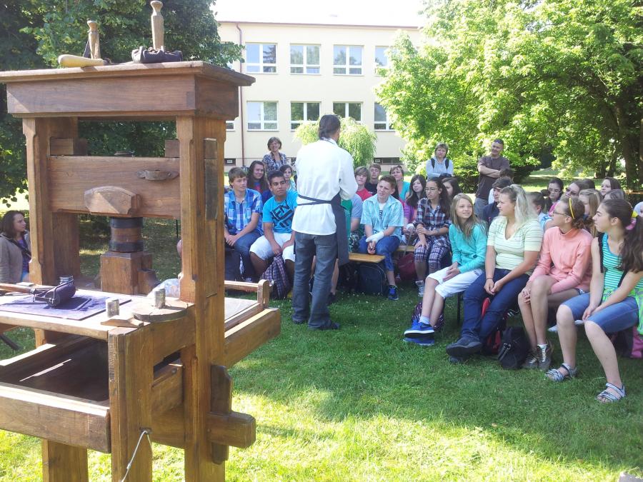 Další zastávkou interaktivních akcí projektu Zábavná vlastivěda z našich vesnic byl Velký Týnec. V den pořádání akce (čtvrtek 19. 6.) panovalo krásné počasí, a tak "Gutenberg" děti seznamoval s knihtiskem výjimečně ve venkovních prostorách ZŠ. Akce se zúčastnilo přes 70 místních školáků, kteří si mohli např. vyzkoušet vytisknout znak Velkého Týnce či psát perem z bambusu. Nechybělo ani nahlédnutí do obecních kronik. Více o této akci i celém projektu naleznete na oficiálních stránkách: www.vlastiveda.eu.