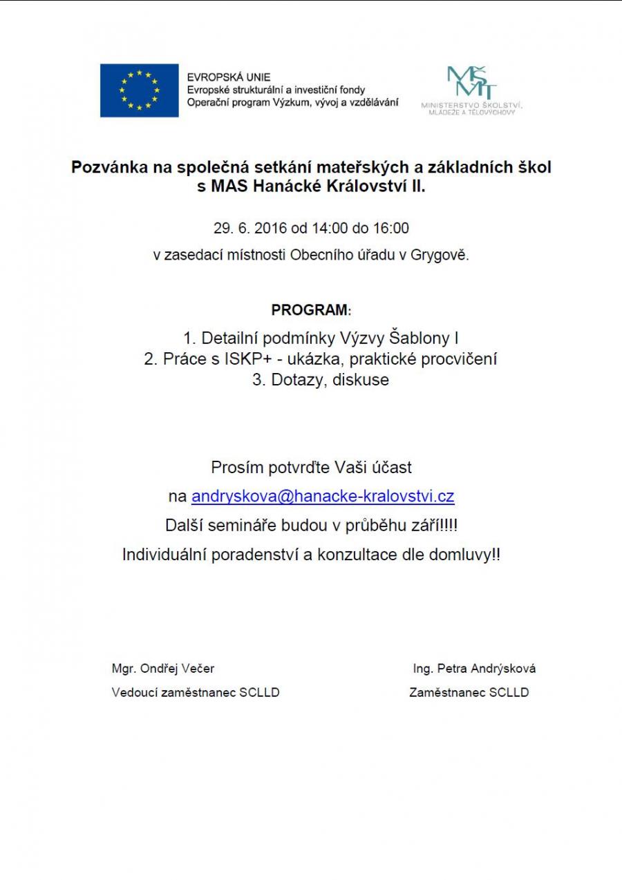 Seminář pro ZŠ a MŠ k tzv. šablonám