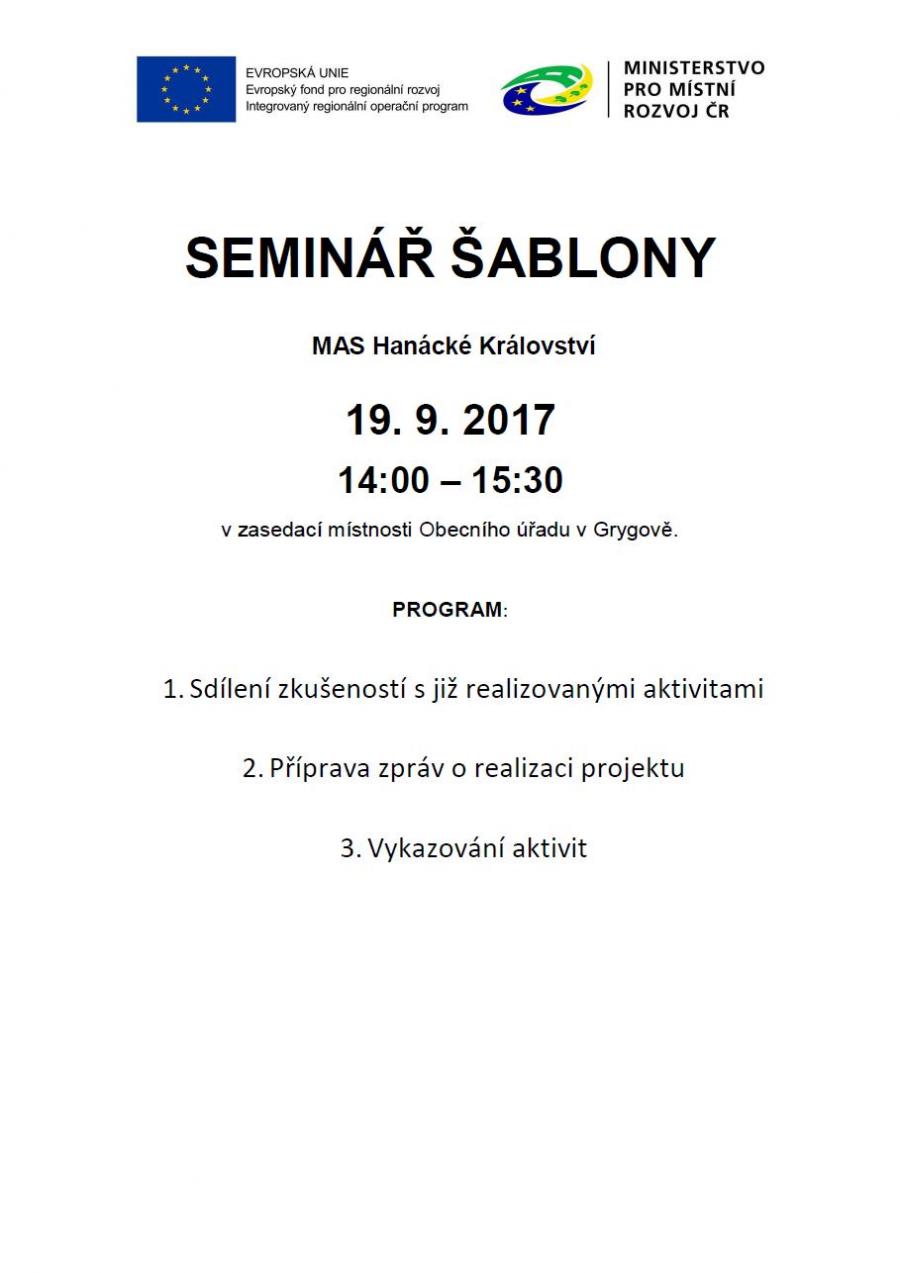 Na úterý 19. 9. 2017 od 14 hod. kancelář MAS Hanácké Království připravila pro ředitele škol a pověřené pedagogické pracovníky z území MAS seminář k realizaci a sdílení zkušeností zjednodušených žádostí o dotaci v OP VVV tzv. šablon. na sdílení zkušeností. Seminář se uskuteční v zasedací místnosti obecního úřadu v Grygově.