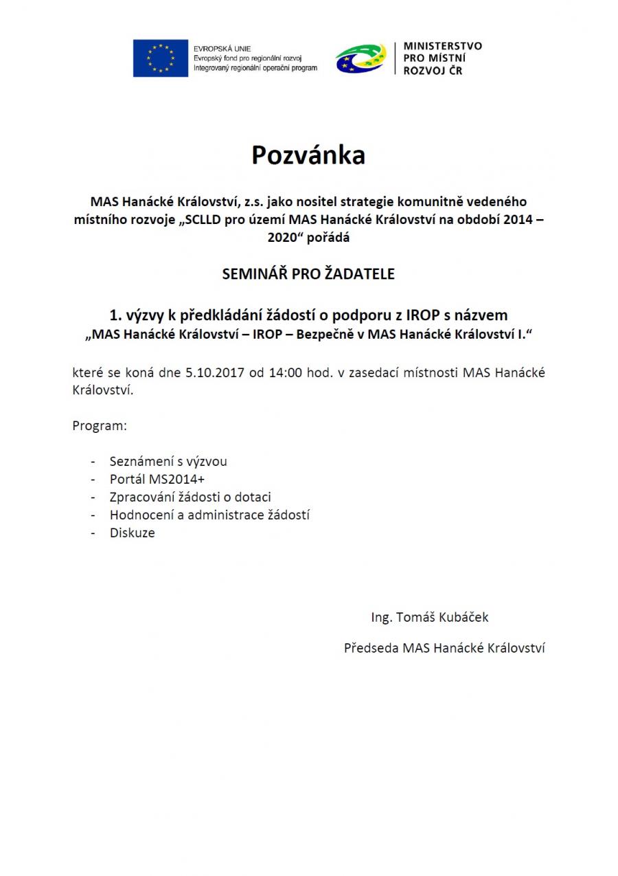 V návaznosti na vyhlášenou Výzvu v IROP: Bezpečně v MAS Hanácké Království I. pořádáme seminář pro žadatele ve čtvrtek 5. 10. 2017 ve 14:00 hod. Seminář se bude konat v zasedací místnosti obecního úřadu v Grygově, Šrámkova 19. Více informací na plakátku.