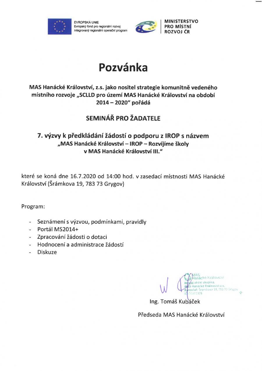 V čtvrtek 16. 7. 2020 se od 14:00 koná seminář pro žadatele v 7. výzvě MAS Hanácké Království v IROP. Seminář proběhne v sídle MAS, Šrámkova 19, Grygov. Další podrobnosti naleznete v přiložené pozvánce.