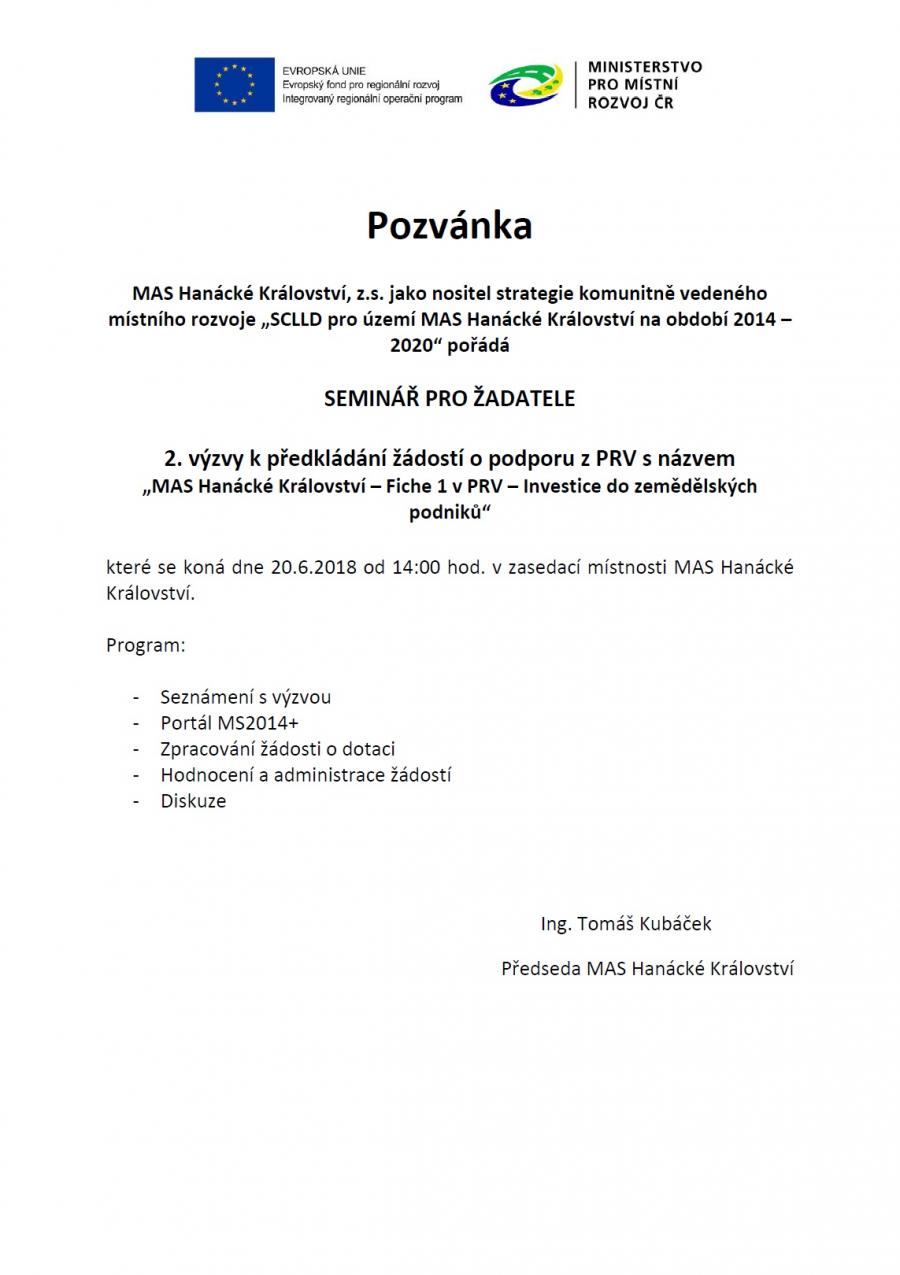 V návaznosti na vyhlášenou Výzvu č. 2 v PRV pořádáme seminář pro zemědělce, který se uskuteční ve středu 20. června 2018 od 14 hod. v sídle MAS Hanácké Království (Šrámkova 19, Grygov). Více informací na plakátku.