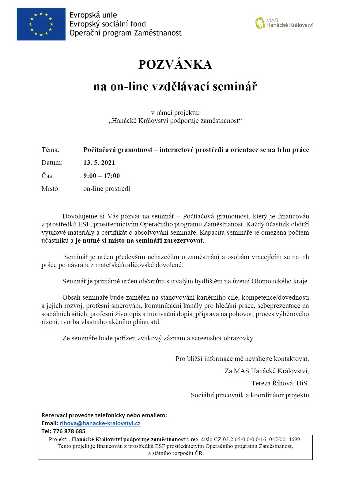 Součástí projektu "Hanácké Království podporuje zaměstnanost" jsou následující semináře: