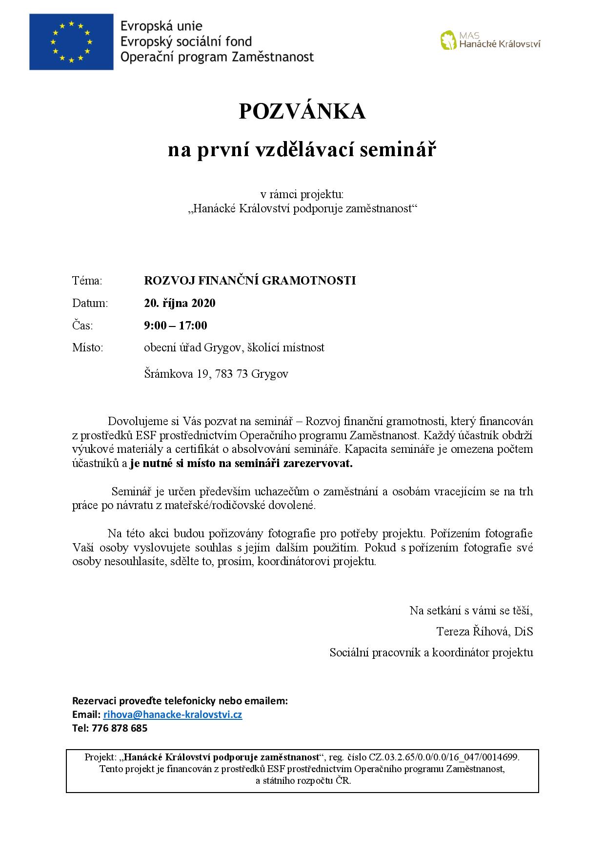 První seminář - Grygov, 20. 10. 2020 - ODLOŽENO
