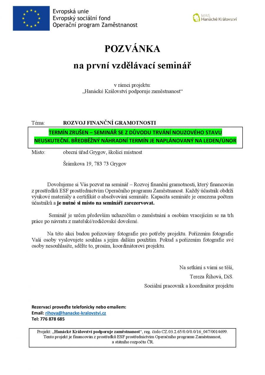 První vzdělávací seminář "Rozvoj finanční gramotnosti" se z důvodu trvání nouzového stavu neuskuteční. Předběžný náhradní termín je naplánovaný na leden/únor.